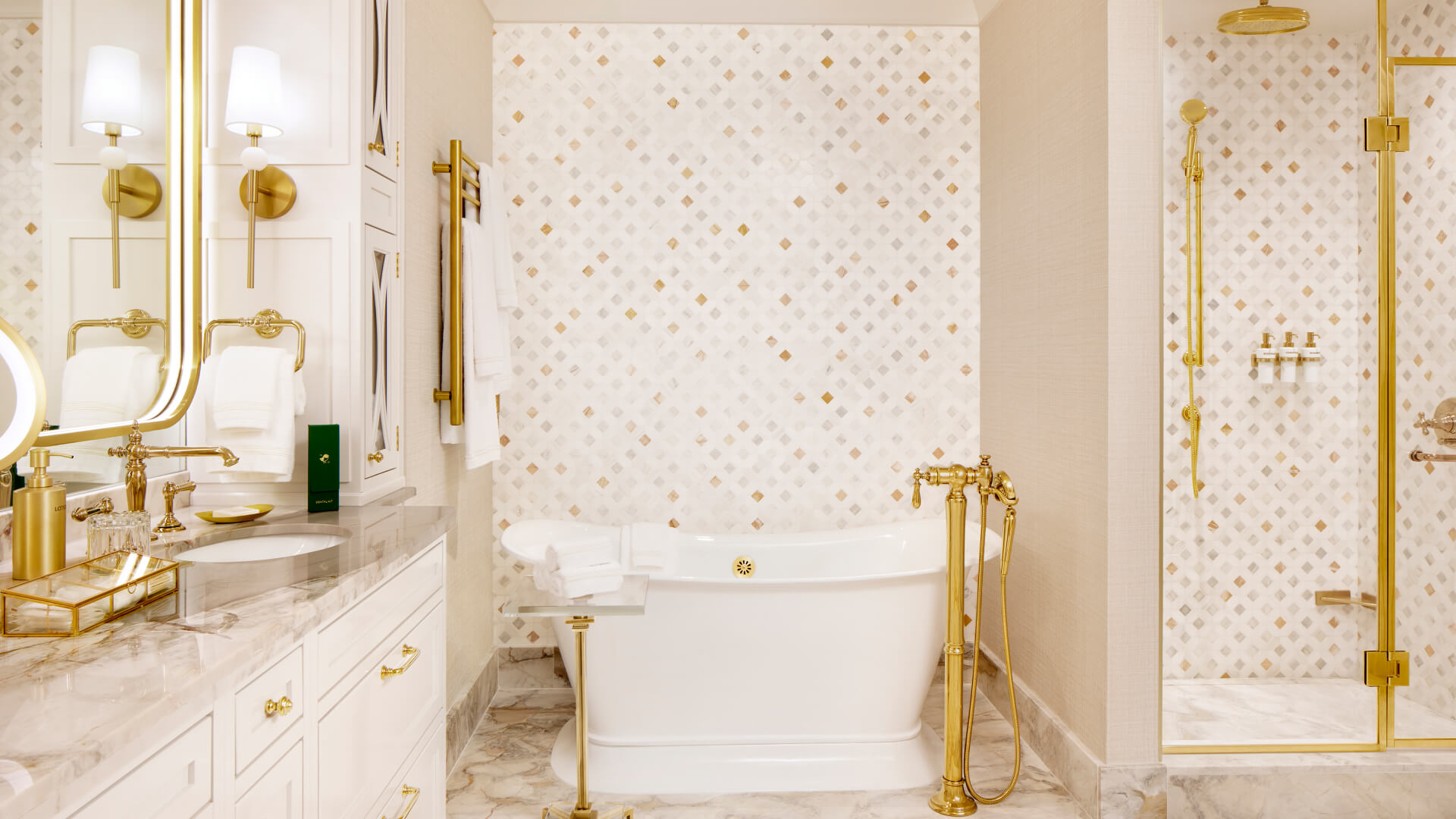 This suite’s refined, classic style offers high ceilings, a glittering chandelier, and sumptuous marble bath features.