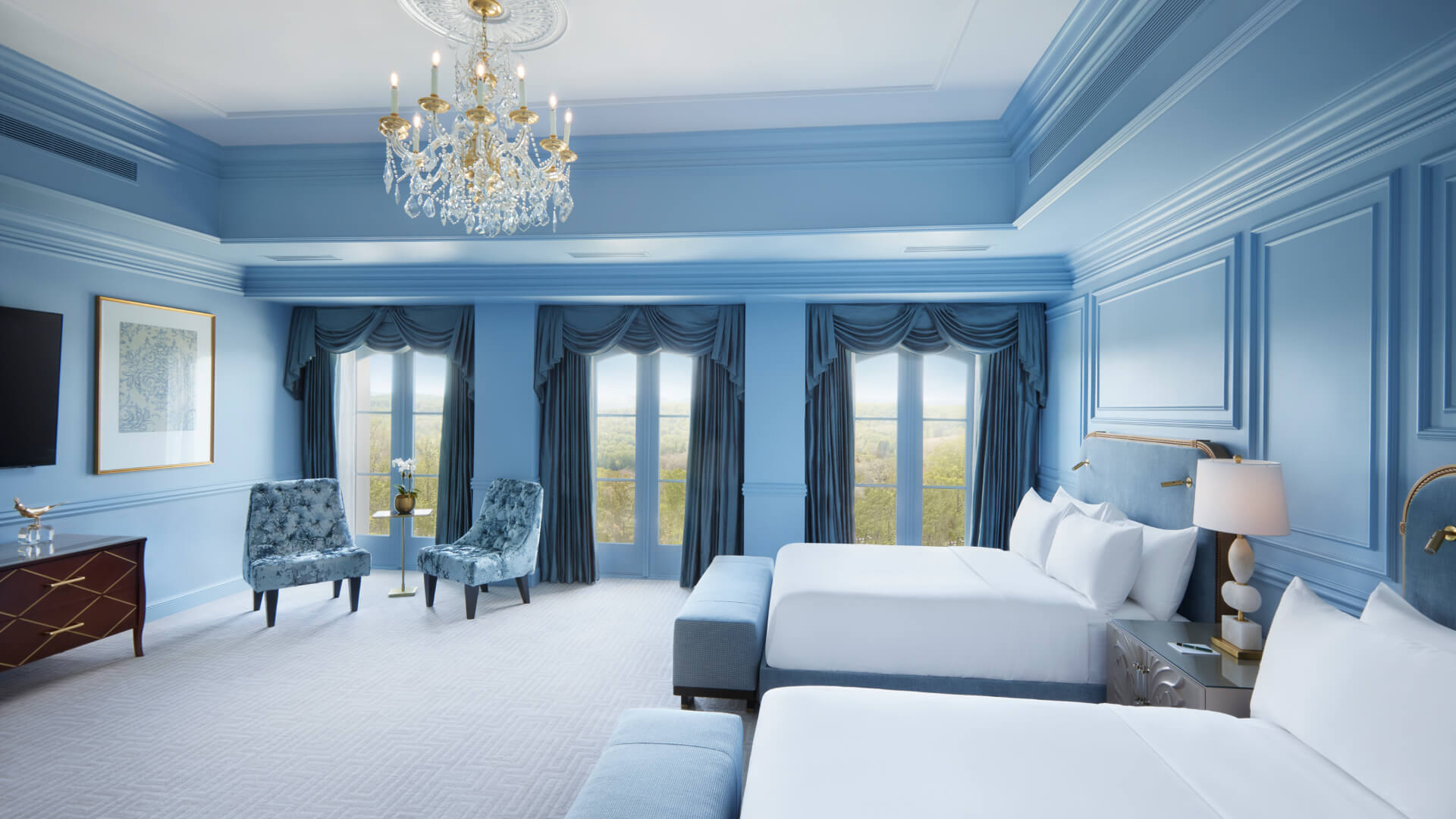 Classic elegance lifts the suite, as warm light filters in through the floor-to-ceiling windows, offering sweeping views of Nemacolin.
