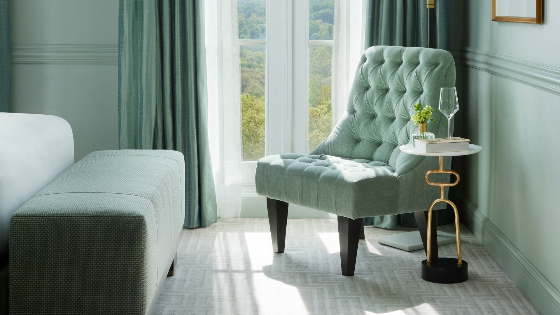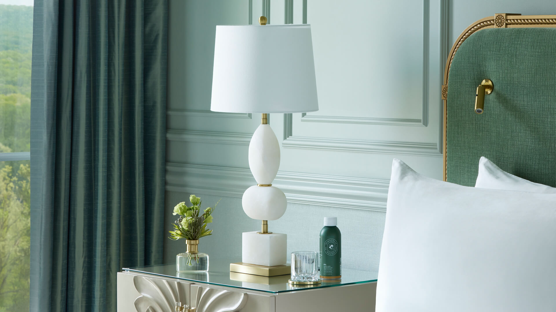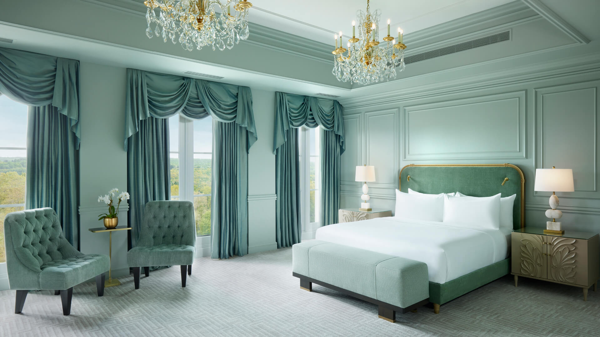 Crisp, fresh bedding, floor-to-ceiling windows, and delicately stylized details inspire a sense of grandeur.