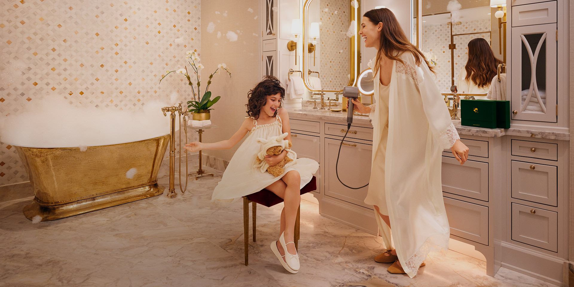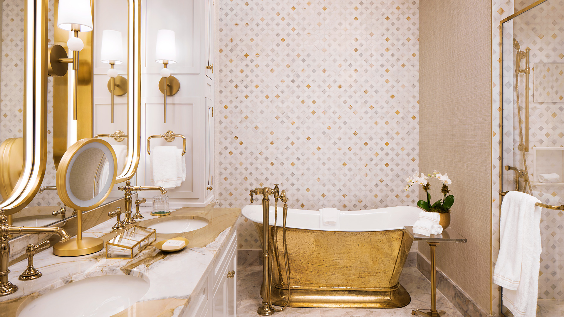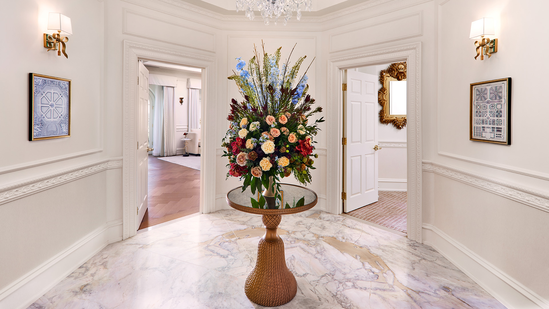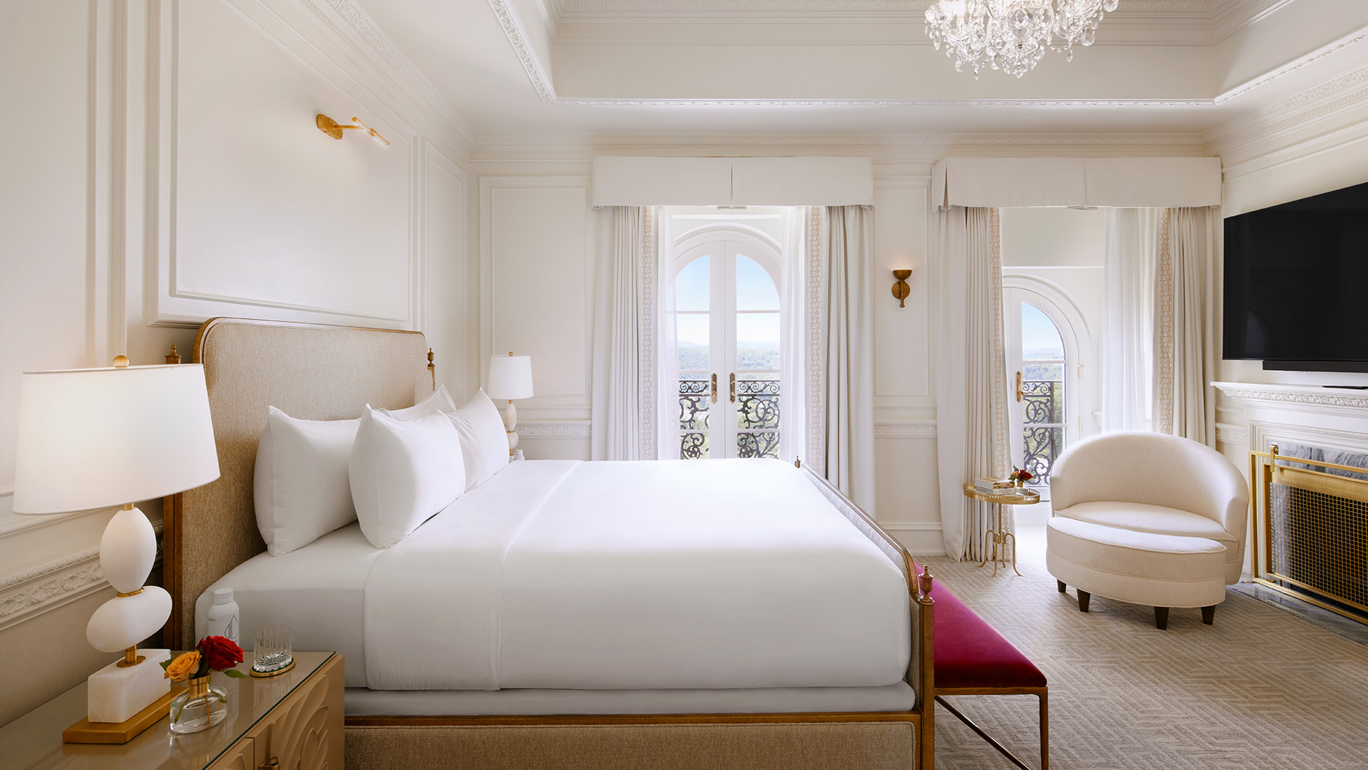 Two generous king bedrooms, a grand dining room, sitting room, attentive butler service, and The Chateau Club floor amenities welcome you to a world of bespoke comfort. The suite emits a curated elegance with thoughtfully designed details and fine finishes glowing under the gentle light of the chandeliers. Swing open the french door-style windows for unrivaled views of the Laurel Highlands and enjoy easy luxury.