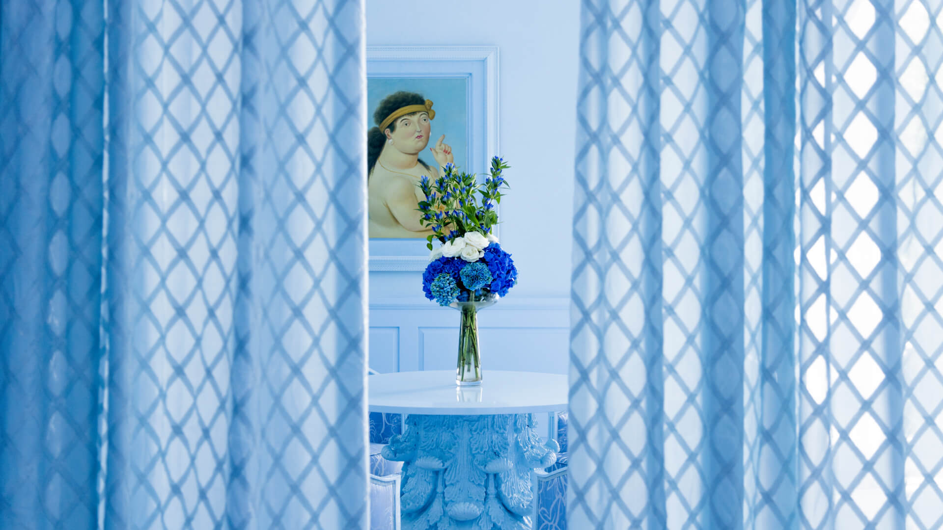 The inspiration and mystery surrounding The Bleu Room is inspired by le cabinet de la Méridienne, a secret room in the Palace of Versailles that was used by Marie Antoinette for her midday nap. Blue marble tiles, a hand-painted ceiling, blue-lacquered furniture, and custom-designed blue moiré fabrics embellish the ambience.