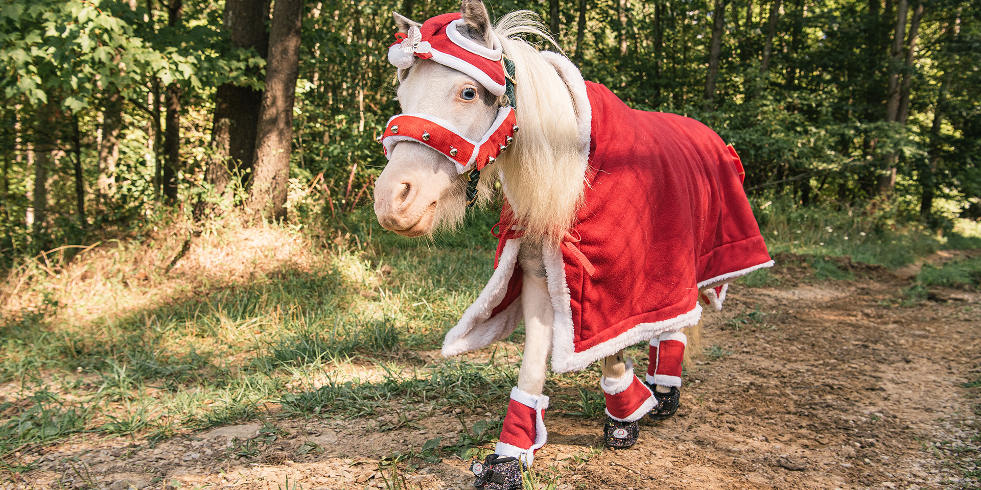 Our horse can attend your event with her included sparkling boots, or you can choose to add on additional attire such as a peach unicorn, rainbow unicorn, slumber party pony, or Christmas spirit outfit. There’s even a pinot pony option where the miniature horse can offer a selection of drinks by way of a special harness while dressed in your selected attire.
