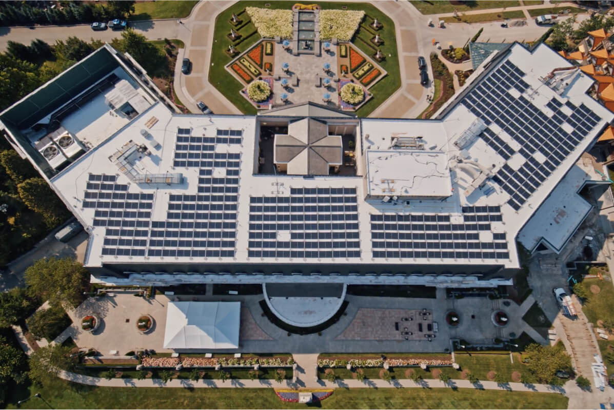In summer of 2023, a 138.8kW array of 308 photovoltaic solar panels was installed on the roof of The Chateau. This array generates 163.7MWh of energy output, enough renewable electricity to power 15 homes.